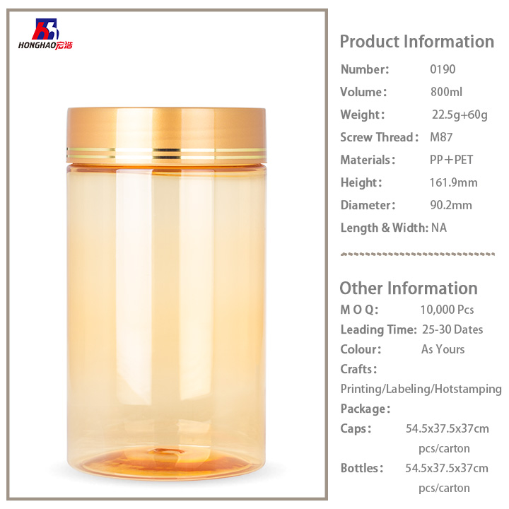 all kinds of food packaging: 800ml candy bottles, medicine bottle, tablet bottle, honey bottle, honey jar, capsules bottle, health bottle